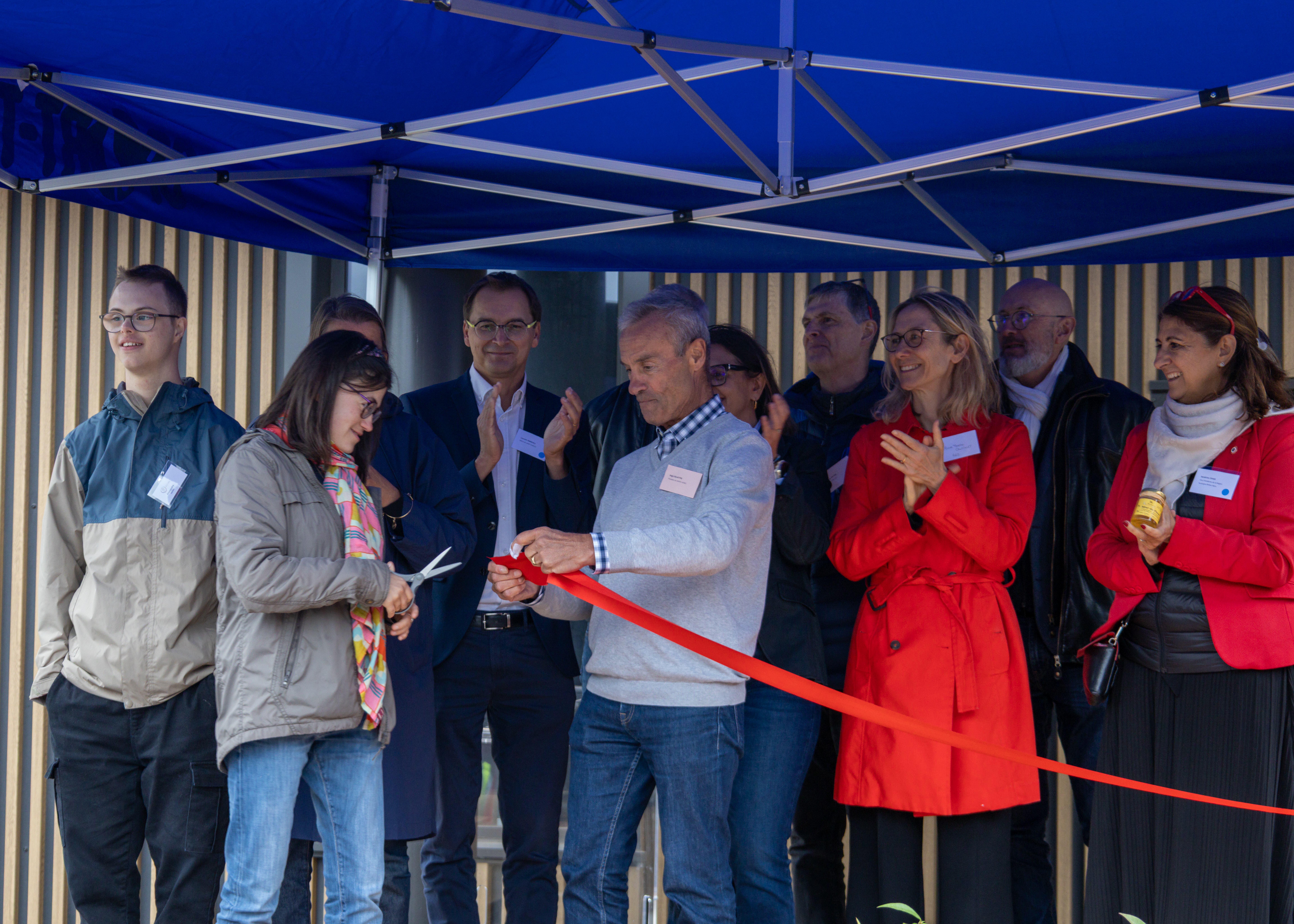 Le coupé de ruban, réalisé à plusieurs mains, a officialisé l’ouverture du lieu, avant un geste symbolique : la remise d’un pot de miel récolté sur place, fruit du travail conjoint des bénévoles et des ouvriers du SERAT.